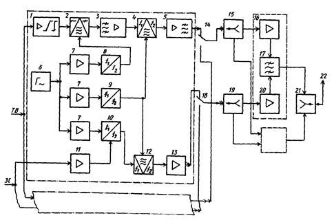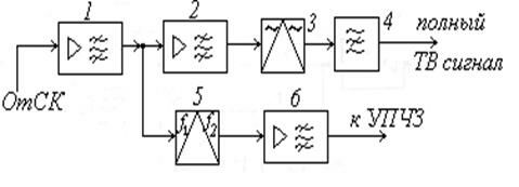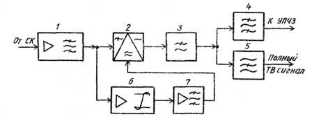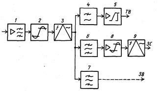 8,5 МГц), усилитель-ограничитель 2, групповой частотный детектор ЧД 3, ФНЧ 4, усилитель-корректор ТВ сигнала 5, полосовые разделительные фильтры 6, 7, усилитель-ограничитель 8 и ЧД сигнала ЗС 9. ФНЧ 4 выделяет из группового сигнала полный цветовой ТВ сигнал, который затем корректируется восстанавливающим корректором и после усиления и дополнительной коррекции (с учетом искажений в тракте ПЧ) подается на вход ТРП или ТР. Туда же поступает и сигнал ЗС, который выделяется ПФ 6 из группового сигнала и обычным путем демодулируется с помощью блоков 8, 9. Аналогично осуществляется выделение и сигналов 3В.