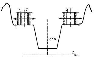 От СЗ к ИСЗ передача идет в диапазоне примерно 6 ГГц, а в обратном направлении (от ИСЗ к СЗ) – 4 ГГц. Мощность передатчика СЗ 5–10 кВт, ИСЗ –40 Вт. Используется ЧМ с девиацией ± 15 МГц, звуковой сигнал передается на поднесущей частоте 7 МГц с девиацией частоты ±150 кГц, девиация несущей сигналом поднесущей – примерно ± 1,5 МГц. На поднесущих частотах 7,5 и 8,2 МГц передаются сигналы 3В и изображений газетных полос (ИГП). В системе предусмотрена возможность временного уплотнения сигналов ЗС и 3В. Два звуконесущих импульса 1 и 2 (рисунок 6.24), модулируемых по длительности звуковыми сигналами, располагаются в интервале гасящего строчного импульса (до синхроимпульса ССИ и после него). Таким способом можно передать, а затем и восстановить без искажений два звуковых сигнала, если их спектр не шире 7,8 кГц. Обычно используются две звуковые программы с полосой 6 кГц. Для передачи звуковой программы с полосой до 10 кГц дискретизация звукового сигнала по времени осуществляется с частотой 2fстp, причем нечетные отсчеты модулируют по длительности звуконесущий импульс 1, а четные – импульс 2.