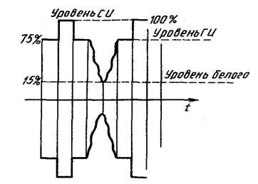 Радиосигнал изображения может быть получен при негативной (рисунок 6.4) или позитивной амплитудной модуляции несущей изображения, при этом уровни гасящего (ГИ) и синхронизирующих (СИ) импульсов должны быть фиксированы. В СНГ принята негативная модуляция, которая имеет следующие преимущества: 1) при одинаковой пиковой мощности, принимаемой за 100%, средняя мощность сигнала (а следовательно, и выходного каскада ТВ передатчика изменяется от 15 до 75 %, тогда как при позитивной — от 25 до 100 %; 2) в нелинейную область амплитудной характеристики выходного каскада ТРП попадают практически только СИ, а переходы сигнала от белого до черного передаются без искажений; 3) более просто выполняется автоматическая регулировка усиления (АРУ) в приемнике, поскольку опорный (неизменный) уровень РСИ, соответствующий синхроимпульсам, имеет максимальное значение; 4) более просто осуществляется выделение СИ для синхронизации разверток в приемнике.