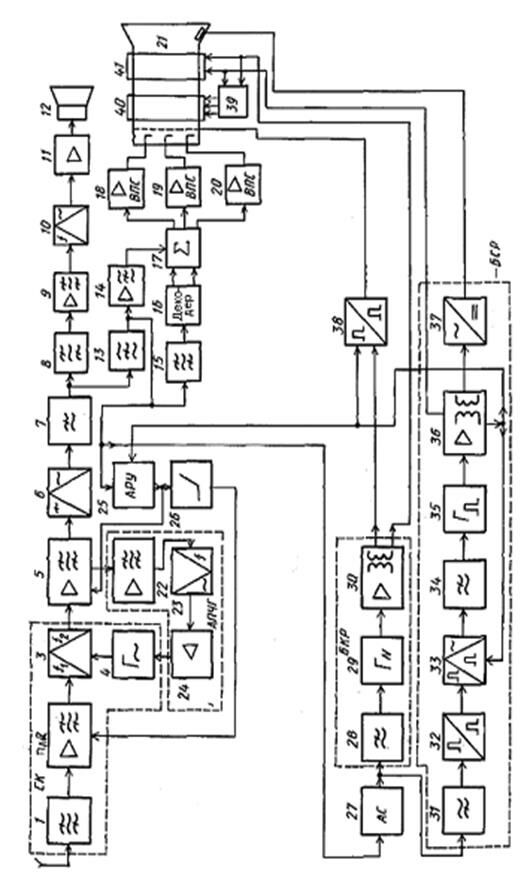Структурная схема приемника черно-белого изображения формально может быть получена из схемы, изображенной на рисунке 6.5, путем исключения ряда блоков, например 15-20, 39, 40 и замены кинескопа.