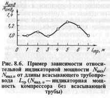 Моделирование системы компрессор — трубопроводы. Еще в 1939 г. русский ученый А. Зеле-нов (МВТУ) установил влияние пульсаций потока газа во всасывающей системе на характеристики компрессора. Пульсации потока во всасывающих и нагнетательных трубопроводах, вызванные периодическими процессами всасывания и нагнетания, обусловливают изменения давления в полостях всасывания и нагнетания. Последние влияют на работу клапанов, а также на производительность и потребляемую мощность компрессора. На рис. 8.5 показаны диаграммы движения нагнетательного клапана в одном и том же компрессоре с нагнетательным трубопроводом различной длины, а на рис. 8.6 представлена зависимость относительной индикаторной мощности поршневого компрессора от длины всасывающего трубопровода (за единицу принята индикаторная мощность при отсутствии всасывающего трубопровода).