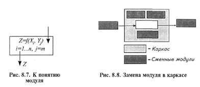 Каркас — это структура, определяющая связи между вариантными гнездами, заполняемыми модулями, и реализующая эти связи при проведении вычислительного эксперимента. При этом можно изменить содержание одного или нескольких вариантных гнезд при сохранении обшей структуры программы (например, применить другую зависимость, определяющую вычисляемую величину). Тогда из вариантного гнезда «вынимают» один модуль, а на его место «устанавливают» другой (рис. 8.8).