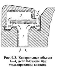 В некоторых математических моделях поршневых компрессоров каналы клапанов представляются самостоятельными контрольными объемами (одним, а иногда и несколькими). Пример выделения нескольких контрольных объемов в проточной части клапана показан на рис. 9.3.