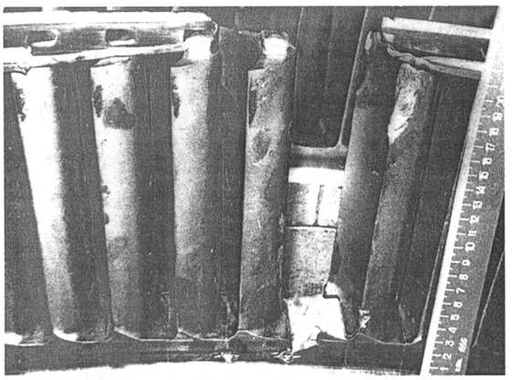 1.9.1.2. Коррозионная усталость хвостовиков. Она возникает по тем же причинам, что и коррозионная усталость рабочих лопаток: из–за совместно протекающих процессов язвенной коррозии и описанной выше усталости. При этом следует иметь в виду, что зазоры в хвостовых соединениях способствуют скоплению в них как агрессивных растворов высокой концентрации из–за их выпаривания, так и твердых отложений, в порах которых концентрируются агрессивные вещества. Эти твердые отложения практически невозможно удалить промывкой. Поэтому, в отличие от поверхностей рабочих частей лопаток, с которых отложения периодически удаляются, постоянно протекающие процессы язвенной коррозии снижают прочность хвостовых соединений.
