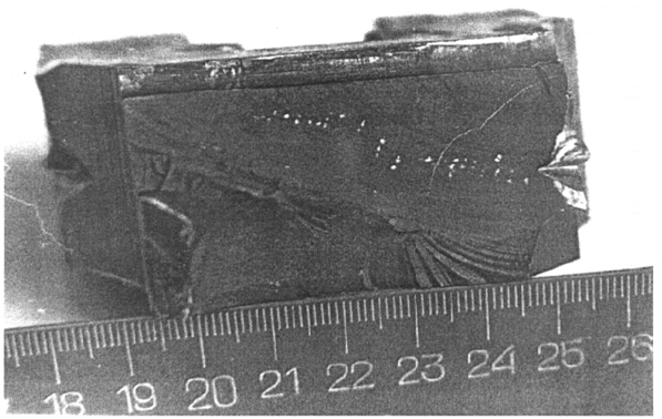 Прежде всего, следует проанализировать характер излома лопатки. Вязкий излом может свидетельствовать о попадании в турбину воды или постороннего предмета, вызвавших высокие напряжения изгиба. Косвенно об этом говорит забоина на соседней лопатке, но она могла быть и следствием удара по ней оторвавшейся лопатки. Рассмотрение излома показывает (рис. 1.47), что он носит явно усталостный характер: на нем видна притертая поверхность, "кольца" развития трещины, когда она достигла большого размера и, наконец, хрупкий отрыв. Значит, причиной поломки лопатки явилась усталость. Первая возможная причина усталостной поломки очевидна: наличие заклепки для крепления замковой лопатки к соседним вызвало дополнительную концентрацию напряжений в сечении хвостовика, близком к корневому. Правда, кажется странным, что в первую очередь не разрушилась замковая лопатка, ослабленная двумя заклепками, однако при размышлении это можно понять, поскольку всегда имеется разброс свойств, технологии изготовления и монтажа, поэтому замковая лопатка могла оказаться и прочнее.