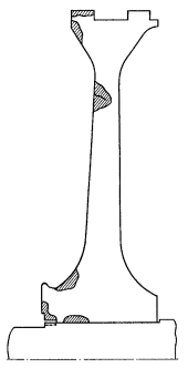 Пример 2.9. На рис. 2.10 показаны зоны коррозионного растрескивания дисков роторов низкого давления американских турбин. Статистика, собранная к 1981 г., показала, что коррозионные разрушения возникли на 131 диске, причем 38 % разрушений происходило в зоне хвостового соединения (рис. 2.11), 29% – на боковых поверхностях дисков, 26 % – в шпоночных пазах и лишь 4 % – на поверхности расточки.