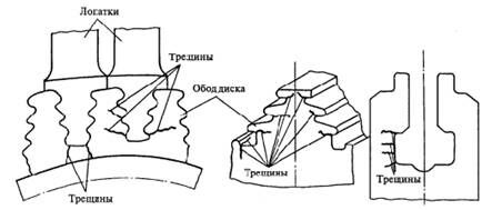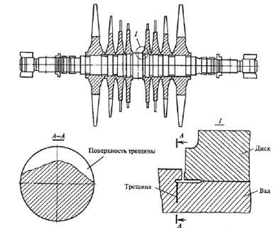 Наибольшую опасность представляет появление трещины на расточке, поскольку это грозит разрывом диска и разрушением всей турбины.