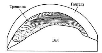 Пример 2.12. На рис. 2.20 показано образование трещины в переходной галтели от последнего диска к шейке вала в цельнокованом роторе ЦНД. Значительную роль в появлении и развитии этой трещины сыграли периодически возникающие концентрированные солевые растворы. При возникновении трещины наблюдалось возрастание вибрации примыкающего подшипника.