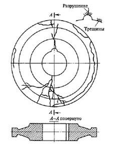 К разрыву диска может привести некачественный металл, из которого он изготовлен, или неправильная его обработка. Следует подчеркнуть, что изготовление качественных поковок дисков в соответствии с теми высокими требованиями, которые к ним предъявляются, сложная технологическая задача.
