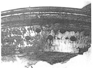 Рис. 2.14. Трещины коррозии под напряжением в отверстиях под заклепки вильчатого хвостового соединения