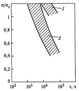 Рис. 2.16. Время до появления трещин коррозии под напряжением в дисковом материале в зависимости от приложенного напряжения в паре (1) и в концентрированном растворе щелочи (2)