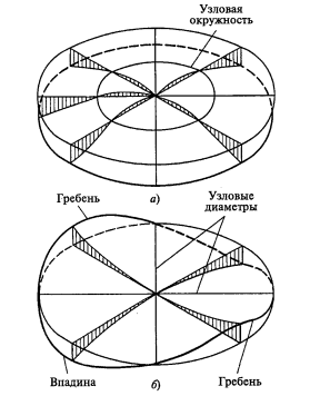 При зонтичных колебаниях все точки диска перемещаются во времени, за исключением точек, геометрическое место которых представляют собой окружности. В простейшем случае такой окружностью может быть окружность примыкания полотна диска к ступице. На рис. 2.18, а показана форма колебаний диска с одной окружностью: при колебаниях точки окружности в пространстве не перемещаются, а точки, расположенные внутри и вне ее, колеблются в разных фазах. На диске могут быть две, три и более узловых окружностей.