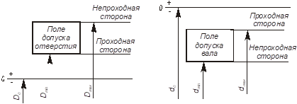 Для построения схем расположения полей допусков необходимы номинальные размеры калибров, которые соответствуют предельным размерам контролируемой калибром поверхности отверстия или вала.