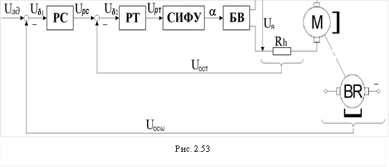 В качестве задатчика обратной связи используется тахогенератор BR, напряжение на выходе которого Uос пропорционально wд.
