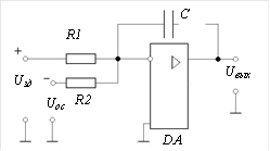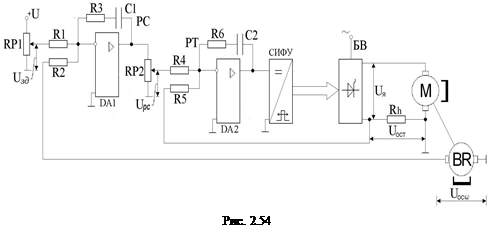 Сравнение электрических сигналов в современных схемах осуществляется на входе операционного усилителя DА. На его инвертирующий вход через резистор R1 подается напряжение задания Uзд, снимаемое с потенциометра RP (задатчика скорости), а через R2 напряжение Uос.