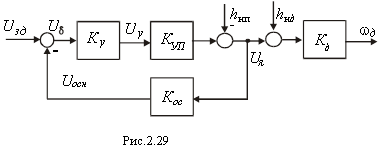 Напомним, как протекает этот процесс. Если, например, под действием нагрузки wд начинает снижаться, то уменьшается Uос, а напряжение Ud, в соответствии с выражением (2.30), начинает увеличиваться. При этом возрастает напряжение на выходе усилителя Uу и якоре двигателя Uя. В результате угловая скорость стремится к заданному значению. Несложно убедиться, что в случае возрастания wд, действие обратной связи приведет к снижению Uя, и угловая скорость вновь будет стремиться к заданной.