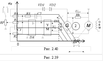 Схема отличается от рассмотренной выше с обратной связью по скорости (см. рис. 2.25) только тем, что в ней сигнал обратной связи снимается с потенциометра RP2 и пропорционален напряжению на якоре Uя. Конструктивно система несколько проще предыдущей за счет отсутствия тахогенератора. Регулирование скорости здесь так же осуществляется изменением напряжения на якоре.