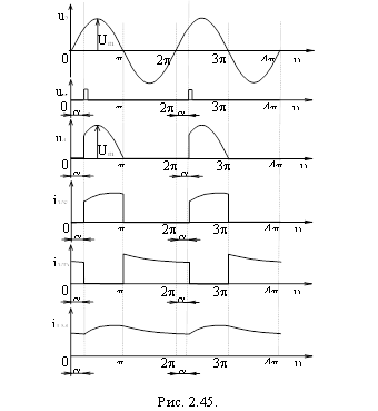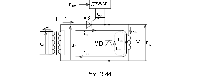 На рис. 2.44 приведена упрощенная принципиальная электрическая схема однофазного однополупериодного нереверсивного управляемого выпрямителя с нулевым диодом.