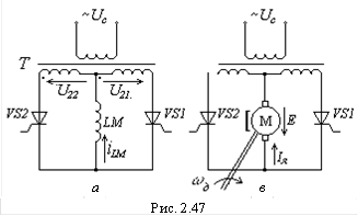 Схема однофазного двухполупериодного тиристорного выпрямителя приведена на рис. 2.47. Нагрузкой на рис. 2.47 а является обмотка возбуждения LM ДТП.