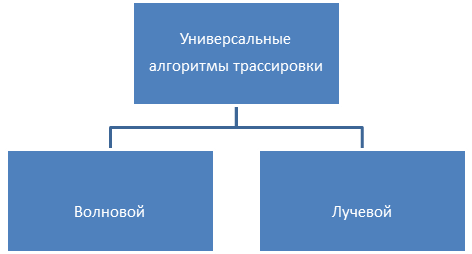 В большинстве случаев используется так называемый волновой алгоритм определения трассы, который позволяет обходить занятые позиции. Идея волнового алгоритма заключается в выборе наименьшего пути из возможных путей обхода препятствия. При этом учитывается минимум изгибов и максимум плотности монтажа.