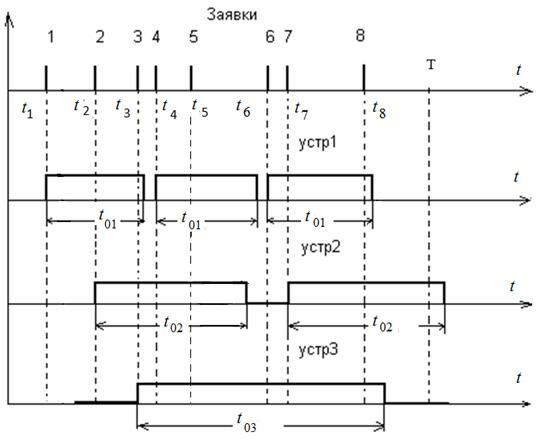 t3 = t2 + ∆t2, где ∆t1, ∆t2 – случайная величина. Для рассмотренного примера заявки 5 и 8 пропадают, так как все устройства заняты.