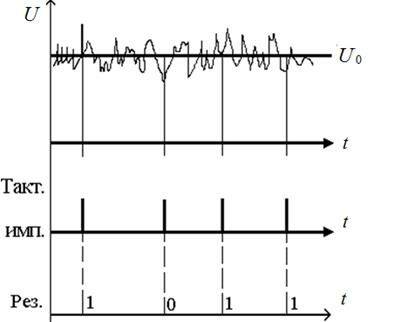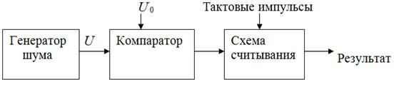 2. Физические датчики, например диоды, транзистора и т.п. Случайное напряжение U с генератора поступает на компаратор, на выходе которого формируется логическая 1 при превышении порога U0 или логический 0, если U < U0. В момент действия тактовых импульсов результат считывается, и на выходе получается последовательность случайных 0 и 1, из которых можно составить числа любой разрядности.