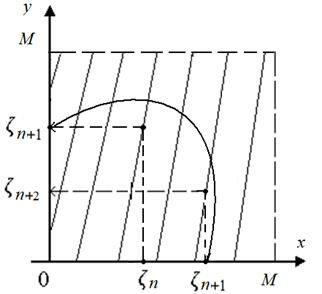 Наиболее часто для генерации равномерного распределения псевдослучайных чисел применяется формула вида 𝜁n+1 = K𝜁nmodM, где 𝜁i – целые числа, K – специально подобранное большое целое число, а операция умножения K𝜁n производится по модулю M. Таким образом, если K𝜁n≥М, то в качестве 𝜁n+1 берется остаток от деления K𝜁n /М. Графически эта функция представляет собой множество прямых линий в квадрате со стороной М. Псевдослучайные числа 𝜁i располагаются на наклонных линиях. Настоящие случайные числа покрывают весь квадрат М×М. Дополнив рассмотренную процедуру преобразованием вида 𝜁*n+1 = 𝜁n+1 /М , получим случайные числа, равномерно распределенные на интервале [0, 1], которые являются базовыми для формирования случайных чисел с произвольным законом распределения.
