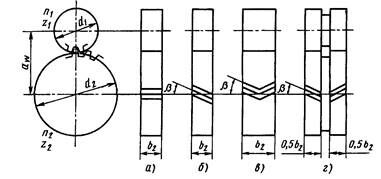 Разновидность косозубых зубчатых колес — шевронные колеса: без канавки (рис. 35,в) и с канавкой для выхода инструмента (рис. 35,г). Вследствие противоположного направления зубьев на полушевронах осевые силы взаимно уравновешены на колесе и не нагружают опоры. Обычно β = 25...40°.