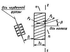 Особенности геометрии и условий работы косозубых зубчатых передач. Зубья косозубых цилиндрических колес нарезают тем же инструментом, что и прямозубых. Ось червячной фрезы составляет с торцовой плоскостью колеса угол β (рис. 38). При нарезании фрезу перемещают по направлению зубьев колеса. Поэтому в нормальной к направлению зуба плоскости все его размеры – стандартные.