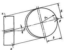 Понятие об эквивалентном колесе. Как отмечалось, профиль косого зуба в нормальном сечении п – п (рис. 38) совпадает с профилем прямозубого колеса. Расчет косозубых колес ведут, используя параметры эквивалентного прямозубого колеса: т