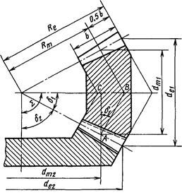 Длину отрезка образующей делительного конуса от его вершины до внешнего торца называют внешним конусным расстоянием Re, до середины ширины зубчатого венца – средним конусным расстоянием Rm (рис. 41).