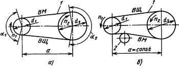 Межосевое расстояние а ременной передачи (рис. 59) определяет в основном конструкция привода машины. Если с целью поддержания постоянного натяжения ремня предусматривают перемещение одного из шкивов, то а – переменно, если на ведомую ветвь (ВМ) устанавливают натяжной ролик 2, то а — постоянно (рис. 59,б).