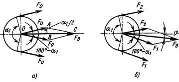 Нагрузка на валы и подшипники. Силы натяжения ветвей ремня нагружают шкивы, валы, на которых они установлены, и опоры валов – подшипники. В покое ветви ремня нагружены силами F0 предварительного натяжения (рис. 65,а); угол между векторами – (180° – a1). Сила, действующая на валы в неработающей передаче: