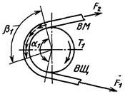 При приложении рабочего вращающего момента Т1 происходит перераспределение сил натяжения в ветвях ремня: ведущая ветвь (ВЩ) дополнительно натягивается до силы F1, а натяжение ведомой ветви (ВМ) уменьшается до F2, (рис. 61,б). Окружная сила определяется: