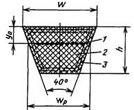 Клиновые ремни имеют трапециевидное поперечное сечение (рис. 67). Ремни работают на шкивах с канавками соответствующего ремню профиля. Профили ремней и канавок шкивов имеют контакт только по боковым (рабочим) поверхностям ремней и боковым граням канавок шкивов. Между внутренней поверхностью ремня и дном канавки шкива должен быть зазор.