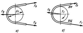 Силы в передаче. Для создания трения между ремнем и шкивом ремню после установки на шкив создают предварительное натяжение силой Fo. Чем больше Fo, тем выше тяговая способность передачи. В состоянии покоя или холостого хода передачи (вращение без передачи полезной нагрузки) каждая ветвь ремня натянута одинаково с силой Fo (рис. 61,а).