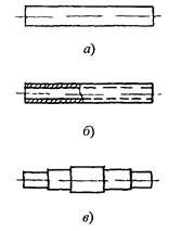 Прямые валы и оси могут быть постоянного диаметра — гладкие (рис. 78,а, б) или ступенчатые (большинство валов, рис. 78,в). По форме поперечного сечения валы и оси бывают сплошные и полые (с осевым отверстием, рис. 29.3,б) Полые валы применяют для уменьшения массы, а также при необходимости пропуска сквозь валы или размещения внутри них других деталей или материалов (масла, охлаждающих газов или жидкостей).