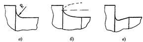Переходные участки валов и осей между двумя ступенями разных диаметров выполняют: с галтелью постоянного радиуса, рис. 79,а (галтель – поверхность плавного перехода от меньшего сечения к большему); с галтелью переменного радиуса (рис. 79,б); с канавкой со скруглением для выхода шлифовального круга (рис. 79,в).