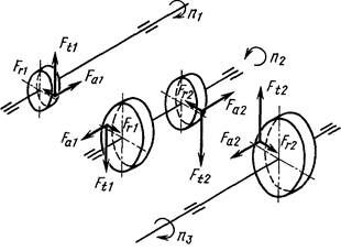 На рис. 80 показана пространственная схема сил, нагружающих валы двухступенчатого цилиндрического зубчатого редуктора с косозубым зацеплением. На расчетных схемах эти силы, а также вращающие моменты изображают как сосредоточенные, приложенные в серединах ступиц. Влиянием силы тяжести валов и установленных на них деталей пренебрегают (за исключением тяжелых маховиков и т.п.). Силы трения в опорах не учитывают.