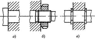 Осевые силы передают: значительные по величине – упором деталей в уступы на валу (рис. 81,а), посадкой деталей с натягом; средние – гайками (рис. 81,б), пружинными плоскими упорными кольцами (рис. 81,в), легкие – пружинными кольцами, стопорными винтами.
