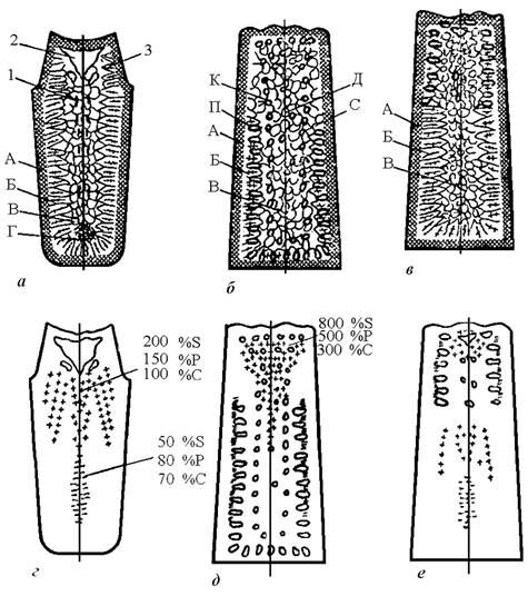 Для устранения усадочных дефектов слитки спокойной стали отливают с прибыльной частью, которая образуется прибыльной надставкой со стенками, футерованными огнеупорной массой малой теплопроводности. Вследствие этого сталь долгое время остается в жидком состоянии и питает усадку слитка, а усадочная раковина образуется в его прибыльной части. Структура слитка спокойной стали, выявленная травлением его продольного осевого разреза (рис. 1. 16, а), имеет следующее строение: тонкую наружную корку А из мелких равноосных кристаллов; зону Б крупных столбчатых кристаллов (дендритов); зону В крупных неориентированных кристаллитов; конус осаждения Г – мелкокристаллическую зону у донной части слитка.