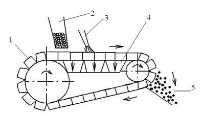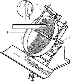 Окатывание применяют для обработки тонко измельченных концентратов. Шихта, состоящая из измельченных концентратов, флюса, топлива, увлажняется и при обработке во вращающихся барабанах, тарельчатых чашах (грануляторах) приобретает форму шариков-окатышей диаметром до 30 мм. Окатыши высушивают и обжигают при 1200…1350 °С на специальных машинах (рис. 1.3).