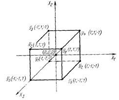 Для линейной модели и трёх исследуемых факторов проводим 8 опытов, т. е. опытные точки расположим в вершинах куба (рис. 1) факторного пространства. Модель будет иметь вид:
