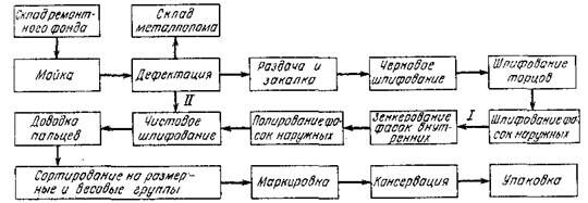 Дефектацию поршневых пальцев выполняют микрокатором 0,5-ИГП и скобами. Анализ ремонтного фонда показывает, что 90 % поршневых пальцев ремонтопригодны, причем до 20 % пальцев имеют наружный диаметр в пределах допуска на новые детали. Поэтому в зависимости от сочетания дефектов технологический процесс разделяется на два взаимосвязанных маршрута. Первый маршрут предусматривает выполнение всех операций, а второй маршрут короче на шесть операций и заключается в шлифовании и полировании пальцев до более низкой размерной группы.