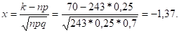 По условию, n=243; k=70; p=0,25; q=0,75. Воспользуемся формулой