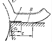 В общем случае поверхность трения на передней поверхности шириной С (рис. 1) состоит из двух участков: участка I (пластического контакта) шириной C1 и участка II (упругого контакта). На участке I расположен заторможенный слой, в пределах которого стружка движется не по передней поверхности, а по заторможенному слою, и сопротивление, оказываемое движению стружки, определяется сопротивлением сдвигу в контактном слое стружки. На этом участке внешнее трение скольжения отсутствует и заменяется „внутренним" трением между отдельными слоями стружки. На участке II стружка контактирует непосредственно с передней поверхностью. Здесь осуществляется внешнее трение скольжения и сопротивление движению стружки определяется силой трения между стружкой и передней поверхностью. Ширина C1 пластического контакта зависит от переднего угла инструмента, толщины срезаемого слоя и коэффициента усадки стружки.