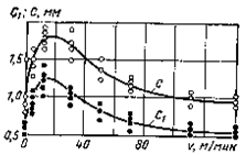 Рис.2.Влияние скорости резания на ширины С и С1 площади контакта ( сталь 30Х, g =5о; b = 5мм; а = 0,149 мм)