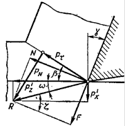 При свободном резании с углом l = 0 силы N и F можно определить, если будут известны действующие на срезаемый слой сила Р'z, совпадающая с вектором скорости резания, и сила Р¢х, ей перпендикулярная (рис. 4). Равнодействующая сил P'z и Р¢х является силой стружкообразования R, наклоненной к направлению Р' резания под углом действия w = arctg Р¢х/P'z. На основании рис. 4 имеем