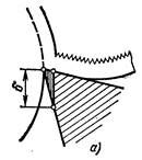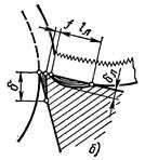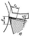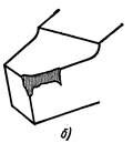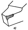 При изнашивании по первому виду (рис. 1, а) на задней поверхности инструмента образуется площадка износа шириной d. Очертания площадки износа в сечении главной секущей плоскостью приблизительно копируют форму поверхности резания. Вдоль главного лезвия ширина площадки износа в общем случае неодинакова. Как правило, максимальная ширина площадки износа наблюдается на переходной задней поверхности или в месте перехода главного лезвия во вспомогательное (рис. 2, а). В некоторых случаях в точке главного лезвия, соответствующей обрабатываемой поверхности, наблюдается локальный износ в виде узкого языка (рис. 2, б).
