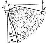 При резании инструментами из твердых сплавов с очень высокими силовой и тепловой нагрузками износу инструмента иногда предшествует пластическое деформирование вершины режущего клина. Формоизменение клина заключается в опускании части передней поверхности, примыкающей к главному лезвию, на расстояние h1 и выпучивании задней поверхности с высотой h2 (рис. 3). В результате искривления задней поверхности на ней образуется нулевой или отрицательный задний угол, способствующий интенсивному изнашиванию инструмента.